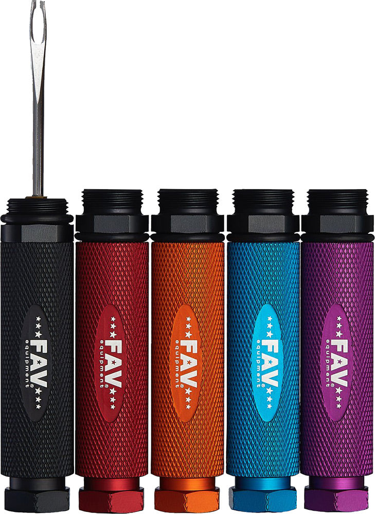 A self contained plugger, handle, and container has been CNC machined to ensure the lightest weight. knurling has been provided for superior grip that allows the user to fix difficult flats. This kit contains 4 bacon strips (2x3.5mm and 2x1.5mm) to plug common flats that can't be sealed by sealant alone. Whether you're racing enduro, XC or just adventuring the Fav Tyre plugger is perfect for those trailside tyre punctures.