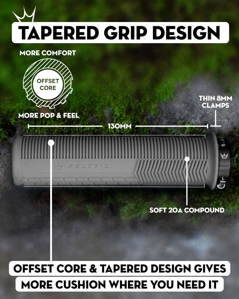 Experience the ultimate grip with Peaty's Monarch Grip - Mushroom. Decades of testing and tweaking have led Peaty's to create the perfect combination of compound and grip pattern for maximum control. Made with a focus on performance and sustainability. Elevate your riding with the new Kings of Control.